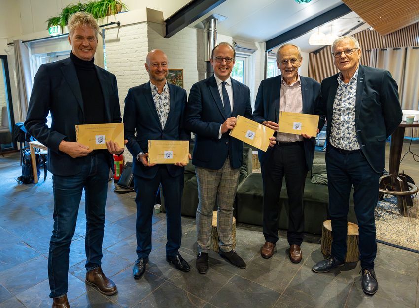Vlnr: Gerben de Boer (Wetterskip Fryslân), Renze Portengen (ministerie van LNV), Friso Douwstra (provincie Fryslân), Pieter Winsemius (Aanvalsplan Grutto) en Piet Dijkstra (voorzitter gebiedscommissie ADD)